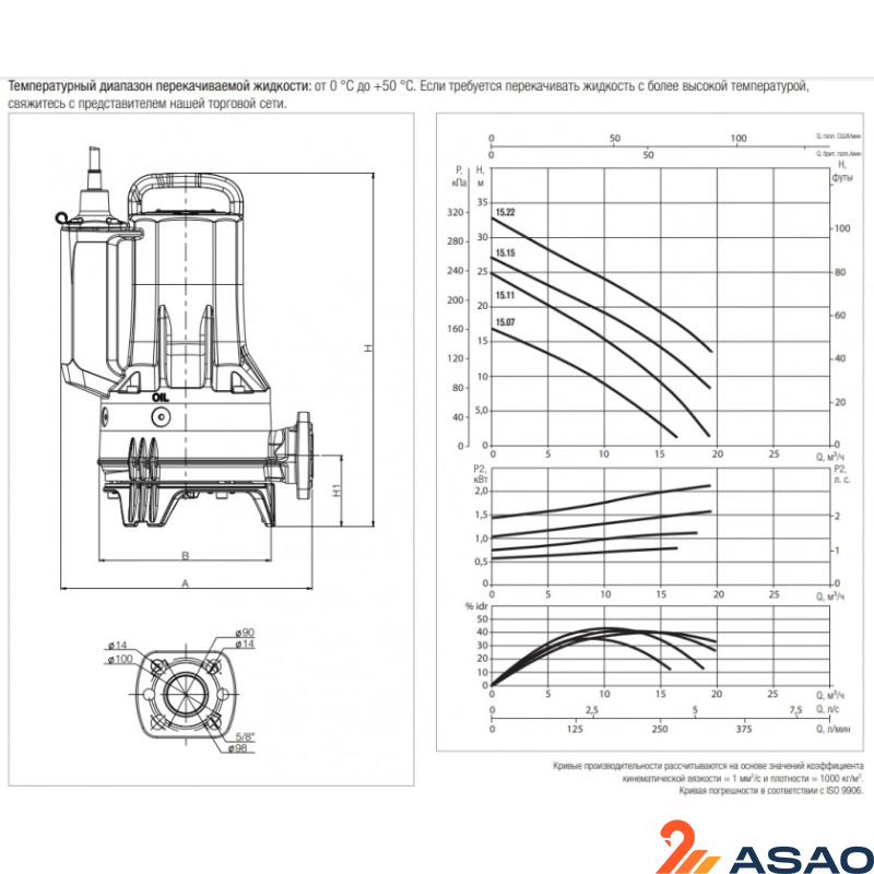 - Корпус насоса и рабочее колесо выполнены из чугуна, измельчитель — из стали AISI 630.