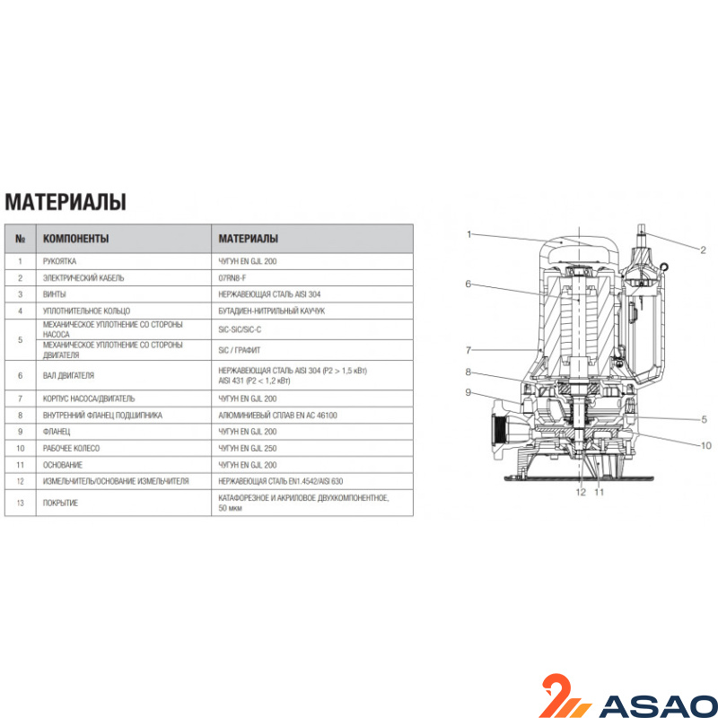- Корпус насоса и рабочее колесо выполнены из чугуна, измельчитель — из стали AISI 630.