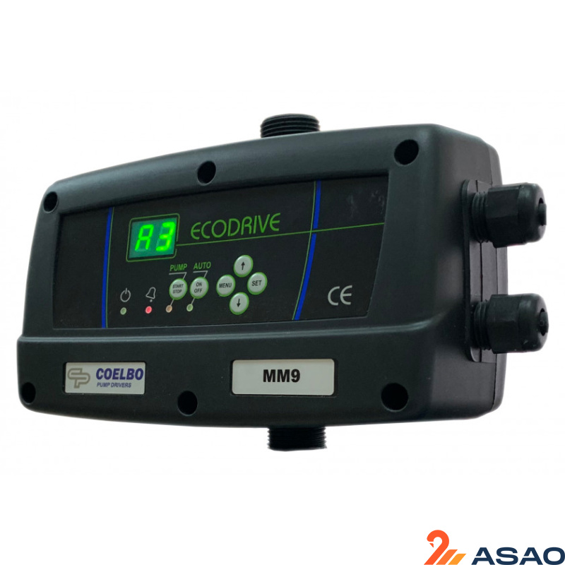 Частотный блок управления насосом Coelbo Eco Drive 9 MM предназначен для управления и защиты однофазного насоса водоснабжения. Мощность инвертора 9А., частотное регулирование от 30 до 50 Гц. Контроллер обеспечивает плавный пуск и остановку насоса, тем самым снижая пусковые токи и увеличивая ресурс насосного оборудования. Очень простое программирование прибора благодаря интуитивно понятному дисплею (2-3 минуты). Встроенный датчик давления, обратный клапан, электронный манометр. Контроллер Eco Drive защищает насос по сухому ходу (с автоматическим перезапуском), предельному току (от перегрузки), от короткого замыкания. Устройство монтируется In-line (на трубопровод), подключение 1" н.р. Широкий диапазон входного напряжения 185 - 275 В., в случае выхода за пределы допустимых значений входного напряжения - прибор блокирует работу насоса. Работает до 80 метров удаления от насоса без синусного фильтра. Данная комплектация контроллера идеально подходит для использования с погружными скважинными насосами любых брендов! (для поверхностных насосов рекомендуем комплектацию Eco Drive 6 с кабелем). Пример подбора частотной автоматики: Находим параметр на насосе "номинальный ток", добавляем 20% полученное значение и есть максимально потребляемый ток. Пример: Насос скважинный однофазный 230 В. 50Гц. потребляемый ток 7,5А. Расчет 7,5 + 20% = 9 Ампер (Eco Drive 9 подходит). Чаще всего используется в системах водоснабжения дачных домов, коттеджей, систем орошения и полива, фермерских хозяйств и т.д.