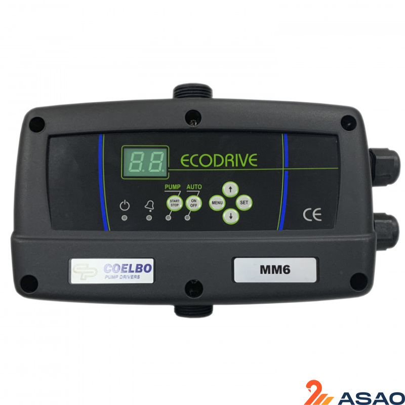 Частотный блок управления насосом Coelbo Eco Drive 6 MM предназначен для управления и защиты однофазного насоса водоснабжения. Мощность инвертора 6А., частотное регулирование от 30 до 50 Гц. Контроллер обеспечивает плавный пуск и остановку насоса, тем самым снижая пусковые токи и увеличивая ресурс насосного оборудования. Очень простое программирование прибора благодаря интуитивно понятному дисплею (2-3 минуты). Встроенный датчик давления, обратный клапан, электронный манометр. Контроллер Eco Drive защищает насос по сухому ходу (с автоматическим перезапуском), предельному току (от перегрузки), от короткого замыкания. Устройство монтируется In-line (на трубопровод), подключение 1" н.р. Широкий диапазон входного напряжения 185 - 275 В., в случае выхода за пределы допустимых значений входного напряжения - прибор блокирует работу насоса. Работает до 80 метров удаления от насоса без синусного фильтра. Данная комплектация контроллера идеально подходит для использования с погружными скважинными насосами любых брендов! (для поверхностных насосов рекомендуем комплектацию Eco Drive 6 с кабелем). Пример подбора частотной автоматики: Находим параметр на насосе "номинальный ток", добавляем 20% полученное значение и есть максимально потребляемый ток. Пример: Насос скважинный однофазный 230 В. 50Гц. потребляемый ток 4,2А. Расчет 4,2 + 20% = 5 Ампер (Eco Drive 6 подходит). Чаще всего используется в системах водоснабжения дачных домов, коттеджей, систем орошения и полива, фермерских хозяйств и т.д.