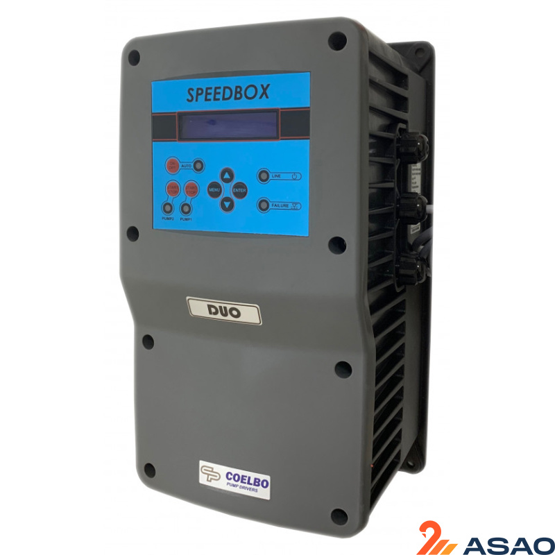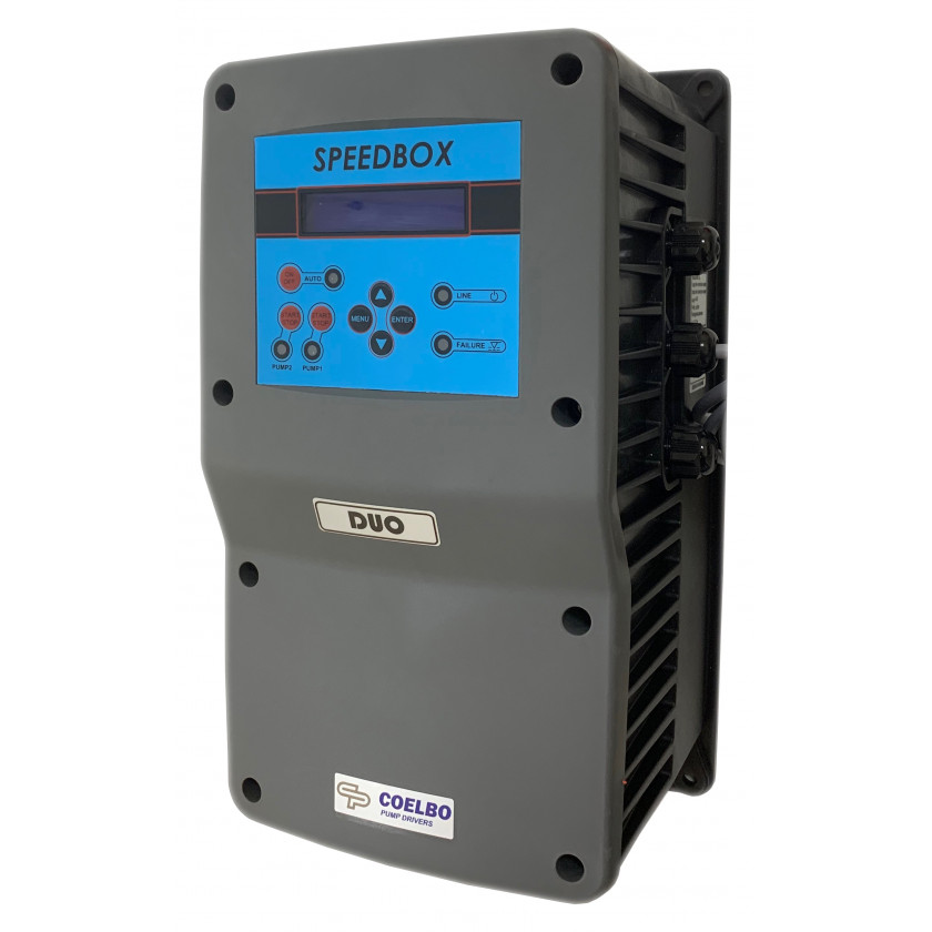 Частотный блок управления насосом Coelbo Speedbox Duo (не имеет аналогов) предназначен для управления и защиты двух однофазных или двух трехфазных насосов водоснабжения. Возможна работа с одним насосом. Выбор режима работы одна или три фазы, осуществляется настройкой через меню прибора. Мощность встроенных инверторов 12Ампер при одной фазе и 10Ампер при трехфазном подключении, частотное регулирование от 30 до 50 Гц. Блок обеспечивает плавный пуск и остановку насосов, тем самым снижая пусковые токи и увеличивая ресурс насосного оборудования. Работа попеременная и одновременная. Очень простое программирование прибора благодаря интуитивно понятному дисплею (занимает всего 2-3 минуты). Контроллер может работать в паре с аналогичным прибором в режиме Мастер-слейв управляя насосами попеременно и одновременно, контролирует наработанные часы двигателей, тем самым одинаково расходуя ресурс каждого насоса. Контроллер Speedbox Duo защищает насос по сухому ходу (с автоматическим перезапуском), предельному току (от перегрузки), от короткого замыкания. Устройство монтируется на клемную колодку электродвигателя, гидравлическое подключение датчика давления 1/4" н.р. Широкий диапазон входного напряжения 185 - 275 В., в случае выхода за пределы допустимых значений входного напряжения - прибор блокирует работу насоса. Подключенные к прибору кабели позволяют не разбирая прибор инсталлировать его экономя время на сборку станции или гидроузла. Данная комплектация контроллера идеально подходит для использования с поверхностными и скважинными насосами любых брендов! Пример подбора частотной автоматики: Находим параметр на насосе "номинальный ток", добавляем 20% полученное значение и есть максимально потребляемый ток. Пример: Насос поверхностный или погружной однофазный 230 В. 50Гц. потребляемый ток 9.7А. Расчет 9.7 + 20% = 11.7 Ампер (Speedbox Duo подходит! Настройка инвертора ~1x230В). Чаще всего используется в системах водоснабжения больших производственных объектах, многоэтажных домов и зданий, в узлах станций водоснабжения