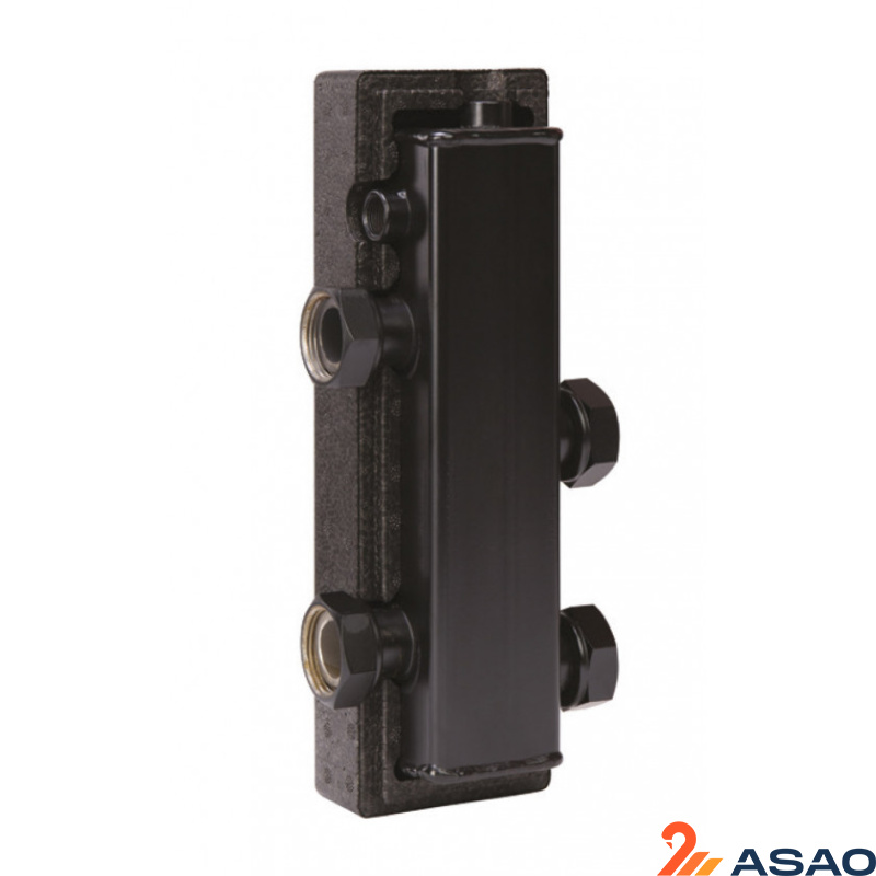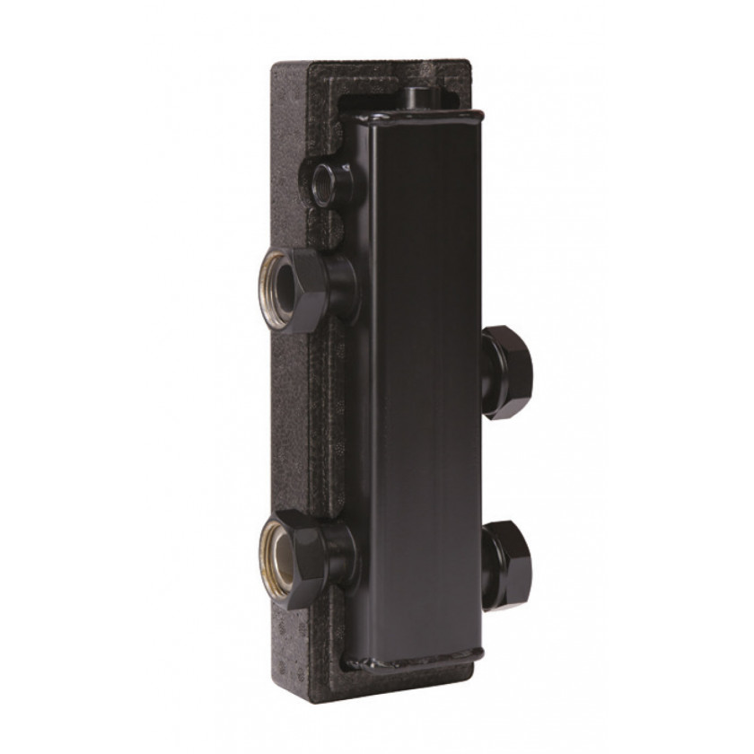 Разделительный модуль (гидравлическая стрелка) - это устройство, исключающее воздействие насосов потребителей тепла на котловые насосы, и наоборот. Позволяет чётко организовать работу многокотельной установки, её высокий КПД работы, помогает конденсационным котлам выходить на максимальную мощность и обеспечивает им длительный срок эксплуатации. Гидрострелка имеет три патрубка (ВР 3/8”) для присоединения воздухоотводчика или гильзы для датчика температуры. Отопительная система должна быть закрытой (без открытого доступа атмосферного воздуха к теплоносителю). Возможна эксплуатация разделительного модуля DN20 в вертикальном или горизонтальном положении. В комплект поставки входят две футорки (НР1” х ВР 3/4”) для подключения источника тепла и паронитовые прокладки.