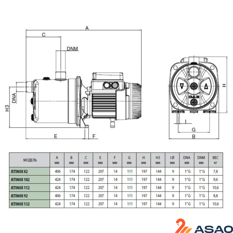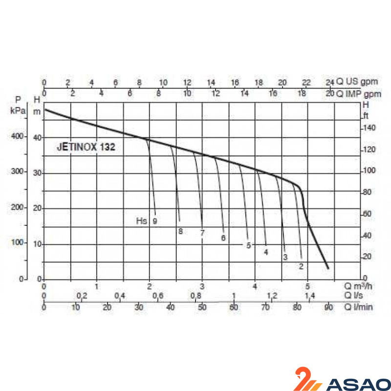 Самовсасывающий центробежный насос с отличной всасывающей способностью даже при наличии пузырьков воздуха. Особенно подходит для водоснабжения в бытовых установках, малом сельском хозяйстве, садоводстве и в случаях необходимости самовсасывания. Jetinox: корпус насоса – нержавеющая сталь. Опора двигателя – чугун, рабочее колесо, диффузор, трубка Вентури и защита от песка – технополимер. Регулировочные кольца – нержавеющая сталь. Торцевое уплотнение – углеграфит/керамика. Закрытый асинхронный двигатель с внешним охлаждением. Встроенный тепловой выключатель и защита от перегрузки по току, конденсатор постоянно включен в однофазном исполнении. Для защиты трехфазного двигателя следует обеспечить защиту от перегрузки, соответствующую действующим нормам. Рабочий диапазон: двухполюсное исполнение от 0,4 до 10,5 м3/ч, напор до 62 м. Диапазон температуры жидкости: от 0 °C до +35°C для бытового применения, от 0°C до +40 °C для прочих применений. Перекачиваемая жидкость: чистая, не содержащая твердых и абразивных включений, невязкая, неагрессивная, некристаллизованная, химически нейтральная. Максимальная температура окружающей среды: +40 °C Максимальное рабочее давление: 8 бар (800 кПа) для Jetinox Степень защиты: IP 44, клеммная коробка – IP 55. Класс изоляции: F