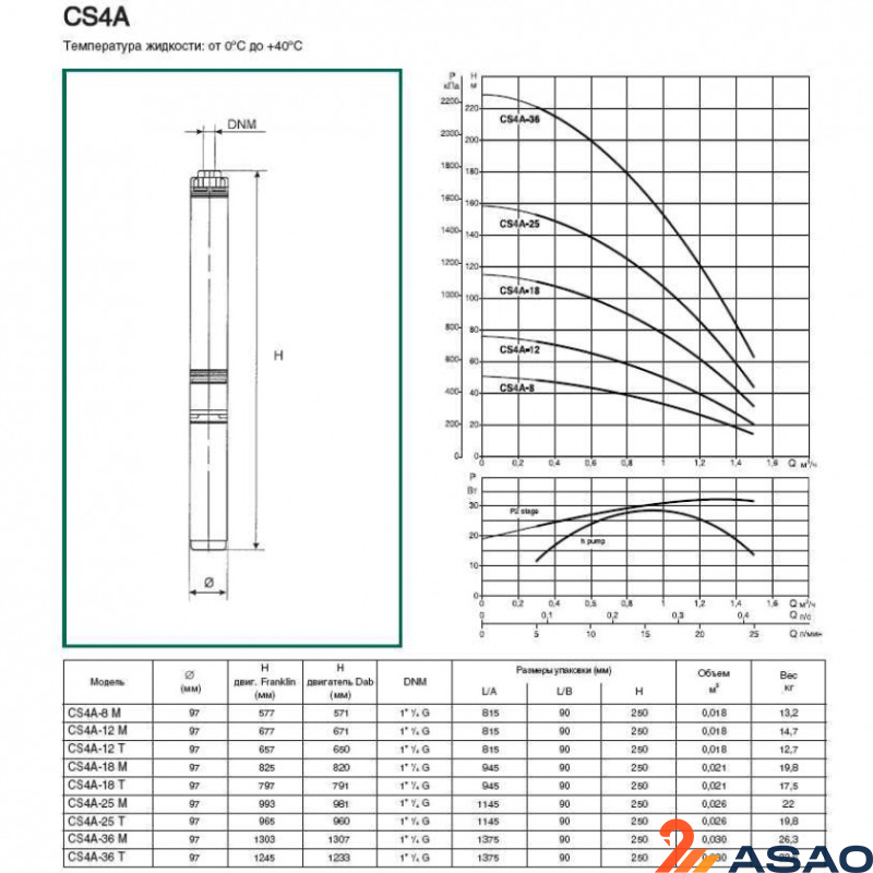 Назначение: Разработано специально для индивидуальных и коллективных систем водоснабжения. Для скважин диаметром 4" и более. Рабочий диапазон: производительность – от 0,24 до 6 куб.м/ч, напор – до 230 м. водяного столба. Перекачиваемая жидкость. Состав: чистая, без твердых включений и минеральных масел, не вязкая, химически нейтральная, по характеристикам аналогичная воде. Максимальное содержание песка в воде –120 г/куб.м. Температура: от 0°С до +40°С. Основные материалы. Рабочие колеса, диффузоры, обратный клапан и основание гидравлической части – из технополимера; кожух гидравлической части, кожух двигателя, валы, муфта, основание двигателя и защитная крышка кабеля – из нержавеющей стали. Особенности. Многоступенчатый скважинный насос. Все однофазные модели укомплектованы устройством Control Box, в которое встроен конденсатор и защита от перегрузки с ручным перезапуском. Дополнительно однофазные модели могут быть доукомплектованы (заказывается отдельно) Control Box HS для увеличения пускового момента. Для трехфазных моделей требуется внешняя защита от перегрузки. Монтаж. Вал двигателя – в вертикальном или горизонтальном положении. В случае горизонтального положения вала необходимо соблюсти требования по нагрузке подшипников и организовать поток жидкости для охлаждения двигателя. Комплект поставки: насос в сборе с кабелем длинной 15 или 30 м и нейлоновым тросом длиной 15 или 30 м в зависимости от модели. Стандартное электропитание: 1x230 В, 3x400 В. Степень защиты: IP 68. Класс изоляции: F.