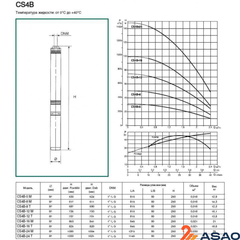 Назначение: Разработано специально для индивидуальных и коллективных систем водоснабжения. Для скважин диаметром 4" и более. Рабочий диапазон: производительность – от 0,24 до 6 куб.м/ч, напор – до 230 м. водяного столба. Перекачиваемая жидкость. Состав: чистая, без твердых включений и минеральных масел, не вязкая, химически нейтральная, по характеристикам аналогичная воде. Максимальное содержание песка в воде –120 г/куб.м. Температура: от 0°С до +40°С. Основные материалы. Рабочие колеса, диффузоры, обратный клапан и основание гидравлической части – из технополимера; кожух гидравлической части, кожух двигателя, валы, муфта, основание двигателя и защитная крышка кабеля – из нержавеющей стали. Особенности. Многоступенчатый скважинный насос. Все однофазные модели укомплектованы устройством Control Box, в которое встроен конденсатор и защита от перегрузки с ручным перезапуском. Дополнительно однофазные модели могут быть доукомплектованы (заказывается отдельно) Control Box HS для увеличения пускового момента. Для трехфазных моделей требуется внешняя защита от перегрузки. Монтаж. Вал двигателя – в вертикальном или горизонтальном положении. В случае горизонтального положения вала необходимо соблюсти требования по нагрузке подшипников и организовать поток жидкости для охлаждения двигателя. Комплект поставки: насос в сборе с кабелем длинной 15 или 30 м и нейлоновым тросом длиной 15 или 30 м в зависимости от модели. Стандартное электропитание: 1x230 В, 3x400 В. Степень защиты: IP 68. Класс изоляции: F.