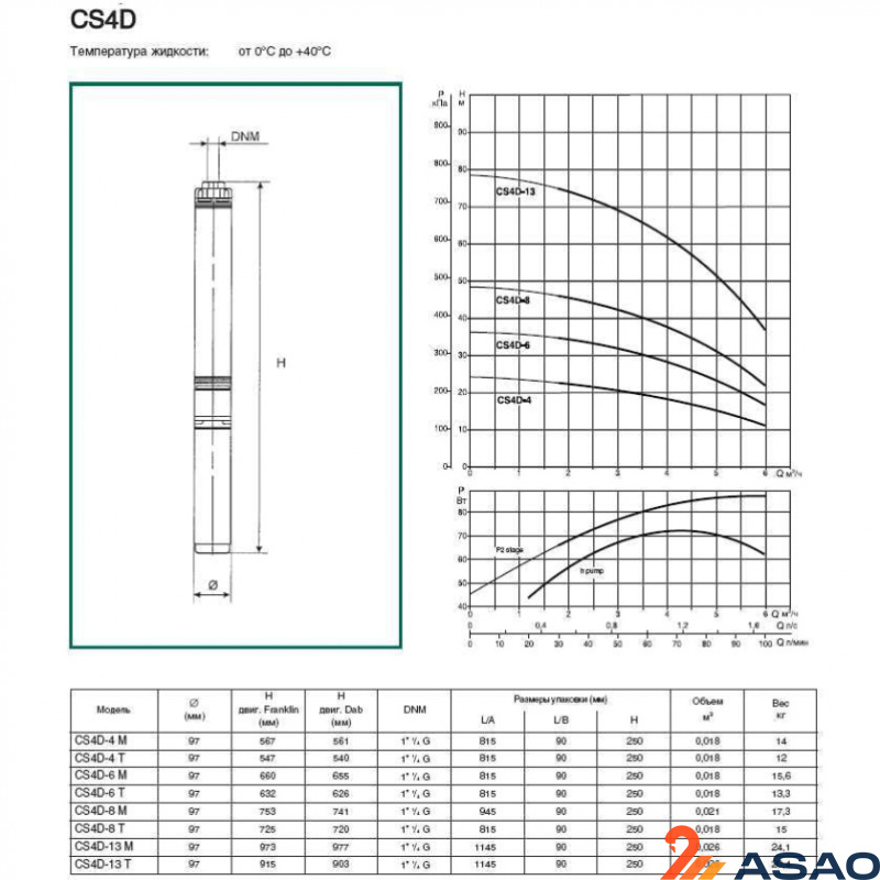 Назначение: Разработано специально для индивидуальных и коллективных систем водоснабжения. Для скважин диаметром 4" и более. Рабочий диапазон: производительность – от 0,24 до 6 куб.м/ч, напор – до 230 м. водяного столба. Перекачиваемая жидкость. Состав: чистая, без твердых включений и минеральных масел, не вязкая, химически нейтральная, по характеристикам аналогичная воде. Максимальное содержание песка в воде –120 г/куб.м. Температура: от 0°С до +40°С. Основные материалы. Рабочие колеса, диффузоры, обратный клапан и основание гидравлической части – из технополимера; кожух гидравлической части, кожух двигателя, валы, муфта, основание двигателя и защитная крышка кабеля – из нержавеющей стали. Особенности. Многоступенчатый скважинный насос. Все однофазные модели укомплектованы устройством Control Box, в которое встроен конденсатор и защита от перегрузки с ручным перезапуском. Дополнительно однофазные модели могут быть доукомплектованы (заказывается отдельно) Control Box HS для увеличения пускового момента. Для трехфазных моделей требуется внешняя защита от перегрузки. Монтаж. Вал двигателя – в вертикальном или горизонтальном положении. В случае горизонтального положения вала необходимо соблюсти требования по нагрузке подшипников и организовать поток жидкости для охлаждения двигателя. Комплект поставки: насос в сборе с кабелем длинной 15 или 30 м и нейлоновым тросом длиной 15 или 30 м в зависимости от модели. Стандартное электропитание: 1x230 В, 3x400 В. Степень защиты: IP 68. Класс изоляции: F.