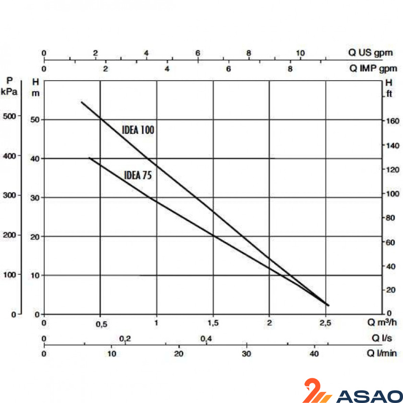 Насос IDEA 75 T разработан специально для индивидуальных и коллективных систем водоснабжения. Для скважин диаметром 4" и более. Рабочий диапазон: производительность – от 0,4 до 2,4 куб.м/ч, напор – до 52 м. водяного столба. Максимальное рабочее давление: максимальная глубина погружения – 20 м. Перекачиваемая жидкость. Состав: чистая, без твердых включений и минеральных масел, не вязкая, химически нейтральная, по характеристикам аналогичная воде. Температура: от 0°С до +35°С. Основные материалы. Гидравлический корпус и основание двигателя – из чугуна; рабочее колесо – из бронзы; кожух двигателя, вал и крепежные элементы – из нержавеющей стали. Особенности. Гидравлическая часть содержит одно рабочее колесо "вихревого" типа. Двигатели однофазных моделей оборудованы встроенным конденсатором. Для трехфазных двигателей требуется внешняя защита от перегрузки. Монтаж. Вал двигателя – в вертикальном положении. Комплект поставки: насос в сборе с кабелем длиной 15 м и нейлоновым тросом длиной 15 м. Стандартное электропитание: 1x230 В, 3x400 В. Степень защиты: IP 68. Класс изоляции: F.