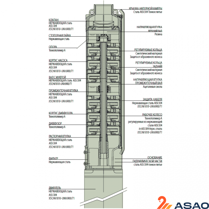 Корпус, рабочие колеса и диффузоры агрегата сделаны из нержавеющей стали.