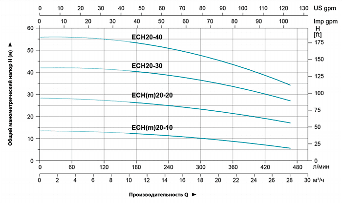 | Модель | Мощность | Q (м3/ч) | 12 | 16 | 20 | 24 | 28 | |