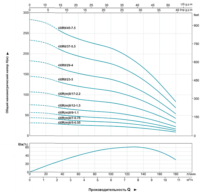 | 4XRm8/5-0.55 | 4XR8/5-0.55 | 0.55 | 0.75 | H (m) | 32 | 31 | 28 | 26 | 25 | 24 | 22 | 18 | 14 | 9 | |