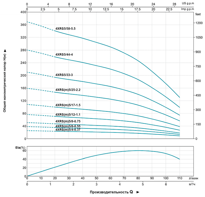 | 4XRSm5/4-0.37 | 4XRS5/4-0.37 | 0.37 | 0.5 | H (m) | 25 | 25 | 24 | 23 | 22 | 23 | 20 | 19 | 17 | 15 | 12 | 9 | |