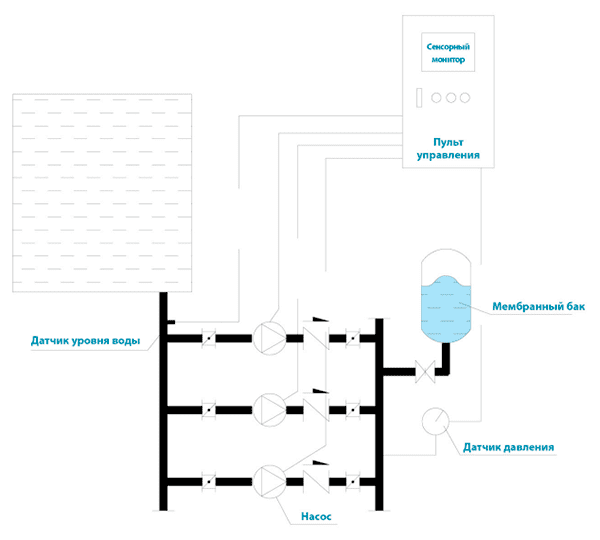 Таким образом, обеспечивается необходимое давление водоснабжения (которое зависит от расхода воды потребителями).