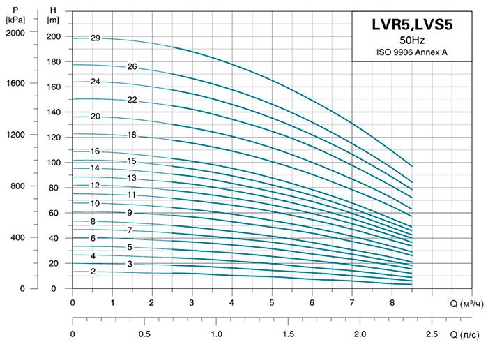 | Вертикальный многоступенчатый насос LVR5-2 | 0,37 | H (м) | 12 | 12 | 10 | 9 | 7 | 6 | 4 | 3,5 |