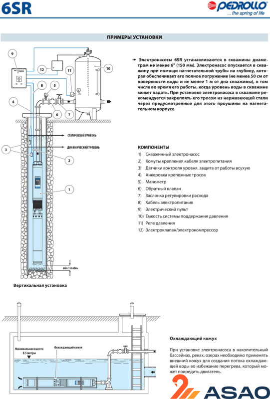 Для безопасной эксплуатации cкважинного насоса Pedrollo 6SR необходимо соблюдать рекомендации размещения насоса в скважине: