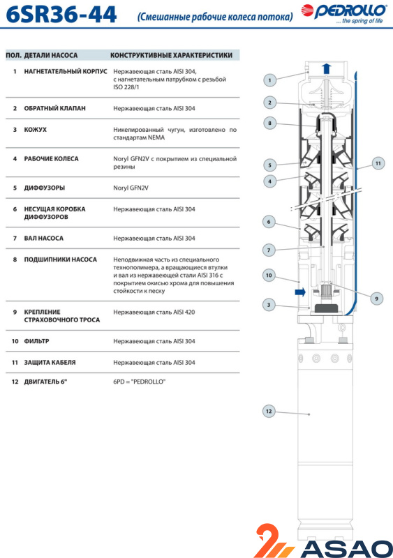 Промышленный скважинный насос Pedrollo 6 SR 44/11-P применяется для забора чистой воды из скважины 6 дюйммов и более.