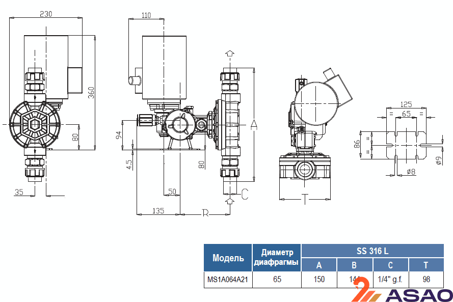 Корпус насоса MS1A064A21 выполнен из алюминия, а дозирующая головка из нержавеющей стали.