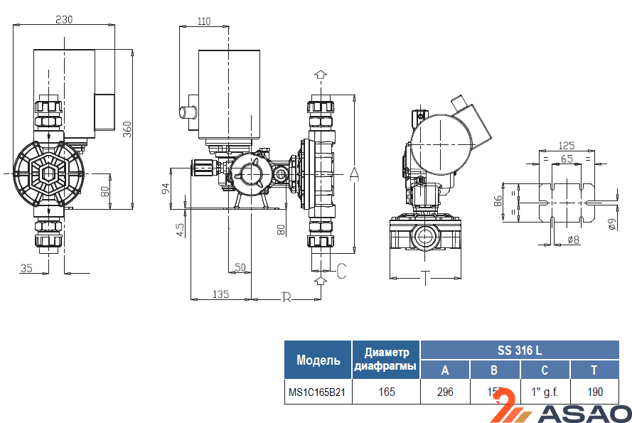 Корпус насоса MS1C165B21 выполнен из алюминия, а дозирующая головка из нержавеющей стали.