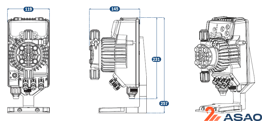 Проточная часть выполнена из материалов с высокой химической стойкостью. Производительность настраивается с помощью ручки потенциометра расположенной на лицевой панели насоса.