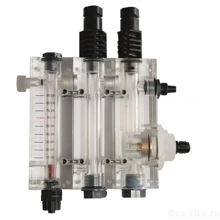 Четырехкамерная ячейка для датчиков Seko. Используется для измерения уровня потенциального хлора (слот под датчик), амперометрического хлора (датчик включен), pH/Redox показателей (разъем под датчик 12 мм) и показаний расходомера. Предназначен для автоматических станций Seko.