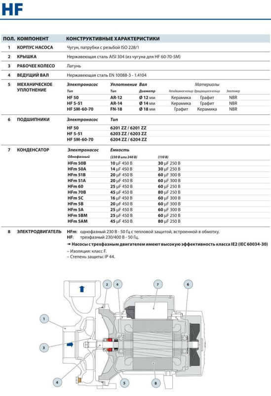 Серия насоса HF включает в себя электронасосы центробежного типа с одним рабочим колесом, разработанные для достижения высоких показателей подачи при средней и низкой величине напора. Рабочее колесо, качающееся на ведущем валу, находится прямо перед всасывающим патрубком, предусмотренного на корпусе насоса. Особая форма рабочего колеса обеспечивает при минимальных гидравлических потерях, радиальное движение жидкости по направлению от центра к периферии, в процессе которого лопасти, имеющиеся внутри канала рабочего колеса, передают энергию накачиваемой жидкости как в виде давления, так и в виде увеличения скорости потока. На выходе из рабочего колеса жидкость устремляется в спираль, которая, совместно с коническим диффузором, обеспечивает преобразование части кинетической энергии в энергию напора.